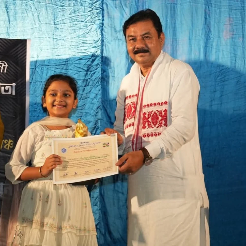 Aradhya Dhar (Class IV) received the Best Child Artist Award for her performance in the Drama Competition organized by Boithok Sahitya Sanskritik Moncho, held at Barpeta Road. She portrayed the lead role of “Mom” in the drama “Shreyashi”, presented under the banner of Natyaned